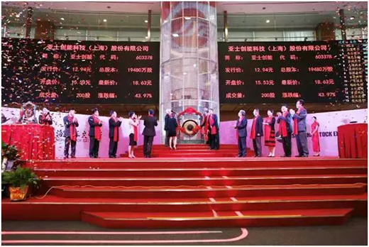 在敲钟仪式上,亚士创能董事长李金钟表示,“亚士创能本次公开发行股票并在上海主板成功上市,代表着公司发展迎来了新的起点和新的征程。全体亚士人一定铭记责任、不忘初心、不辱使命、着力打造企业“可持续发展的绿色生态圈”,以规范的治理、高效的管理、优秀的业绩、高度的责任心来回报股东、造福社会!”