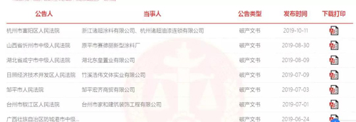 用“涂料”做关键词搜出的部分涂料企业的破产文书