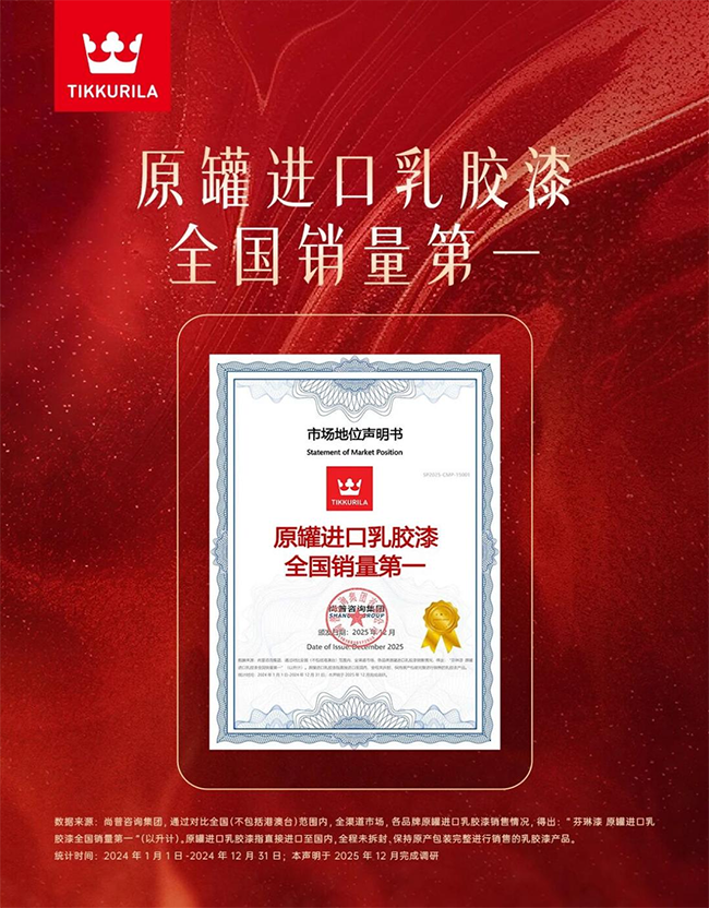 近日,芬琳漆正式获得尚普咨询集团颁发的“中国原罐进口乳胶漆销量第一”市场地位认证书。这一权威认证不仅彰显了芬琳漆在中国高端涂料市场的领先地位,也进一步印证了芬琳在消费者心中的卓越口碑与品牌影响力。
